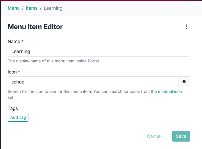 . In the default menu items, you'll see one for the Learning Center. When opening, you can change the name and icon:
