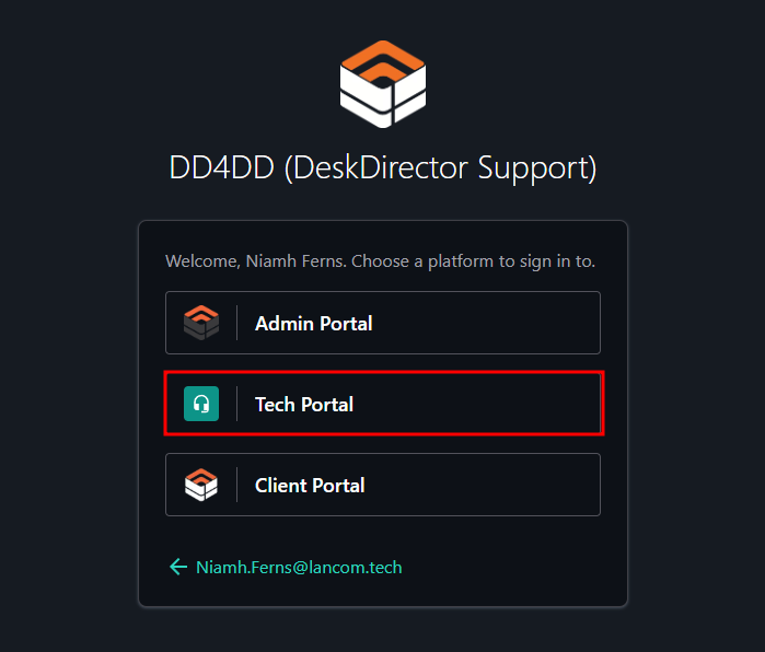 The DeskDirector Tech Portal can be accessed by opening your DeskDirector in a browser then providing your email address in the login form.