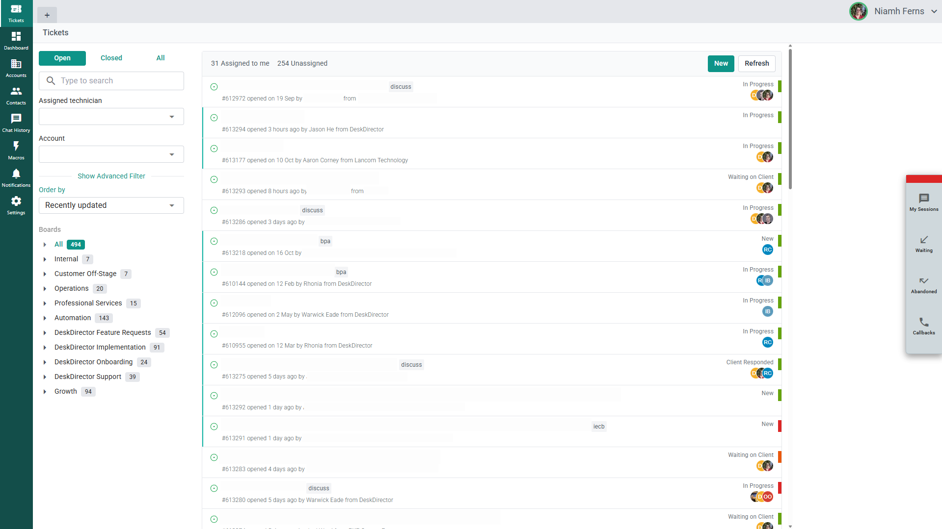 - Ticket List - What appears here are the boards and tickets that the tech has access to, the ticket filters and the option to create a new ticket.