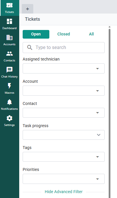 - Create, view, edit, and close tickets from a single interface