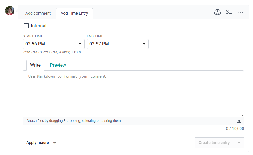 At the bottom of the timeline is the section to add note/time entry/forms: