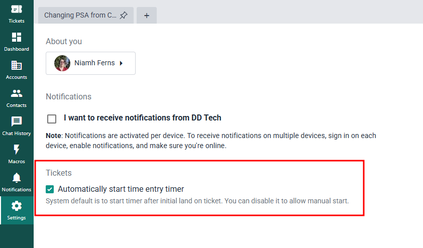 By default, the time entry timer is set to automatically start after landing on a ticket. This can be easily accessed from the Settings page of the Tech Portal.