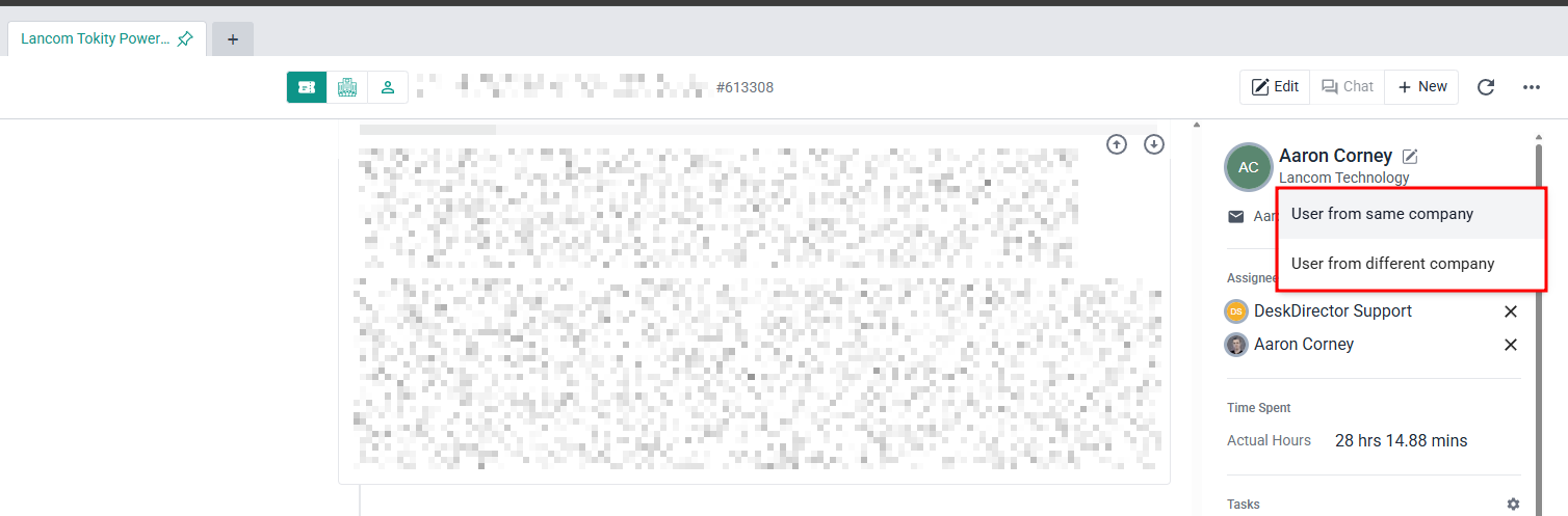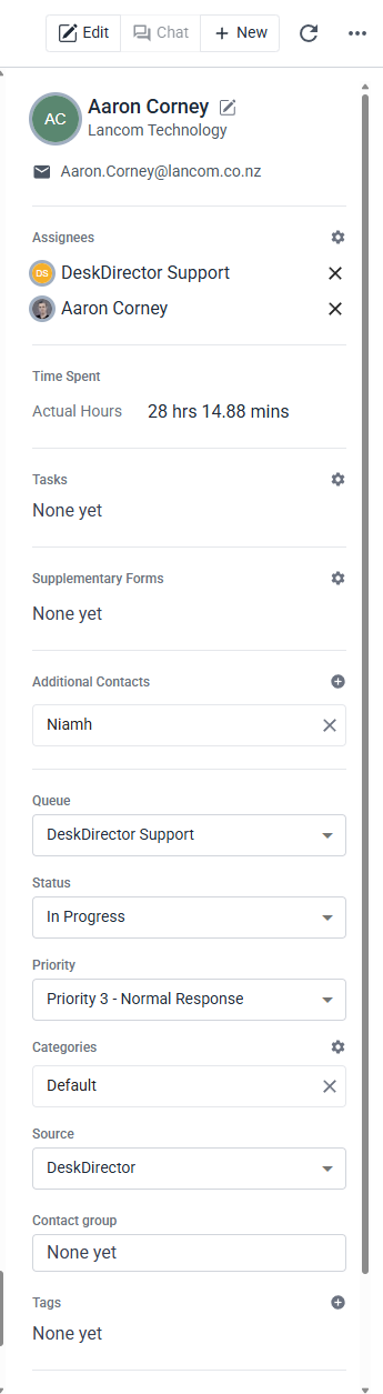 Ticket Contact: This section of the right panel shows who submitted this ticket, and their contact information. As a tech, you can re-assign the ticket contact to someone else by clicking on the "Change" link. If the customer is also online, and he has Chat Permissions set, a tech should be able to push a chat to the contact via the "Chat with ___" button.