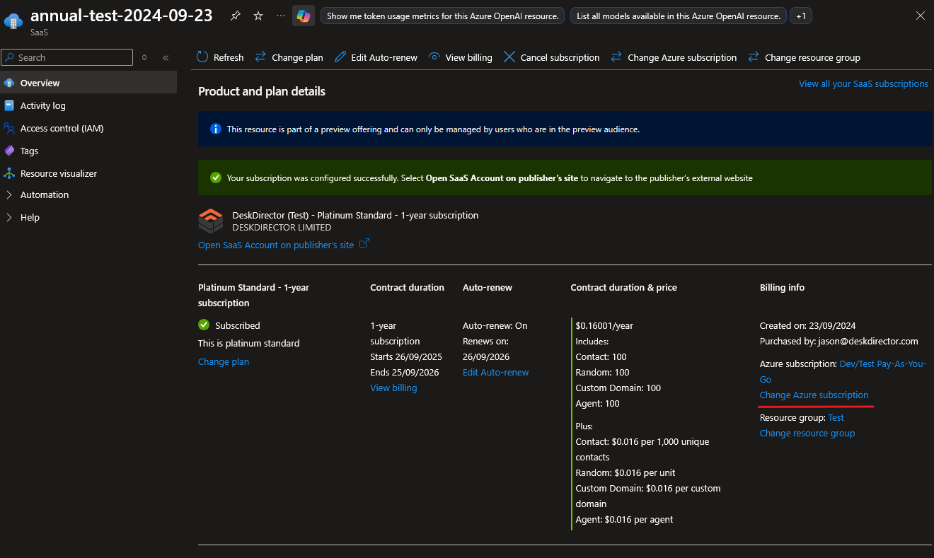 You can move your DeskDirector subscription between Azure subscriptions and a managed billing account as well, if desired:
