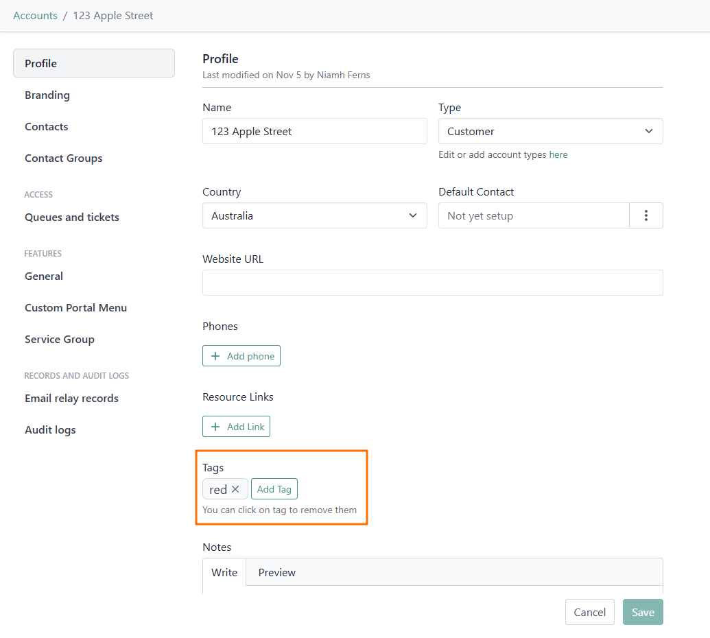 Or, you can add tags to a ticket via inheritance. That is, if you have an entity like an account or a contact, when they raise a ticket, the ticket will automatically inherit their tag. This is particularly useful with service types and forms!
